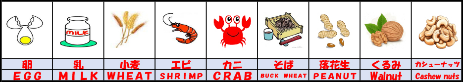 雞蛋、乳、小麥、蝦、螃蟹、蕎麥麵、花生、胡桃、加修堅果等9個品種以及