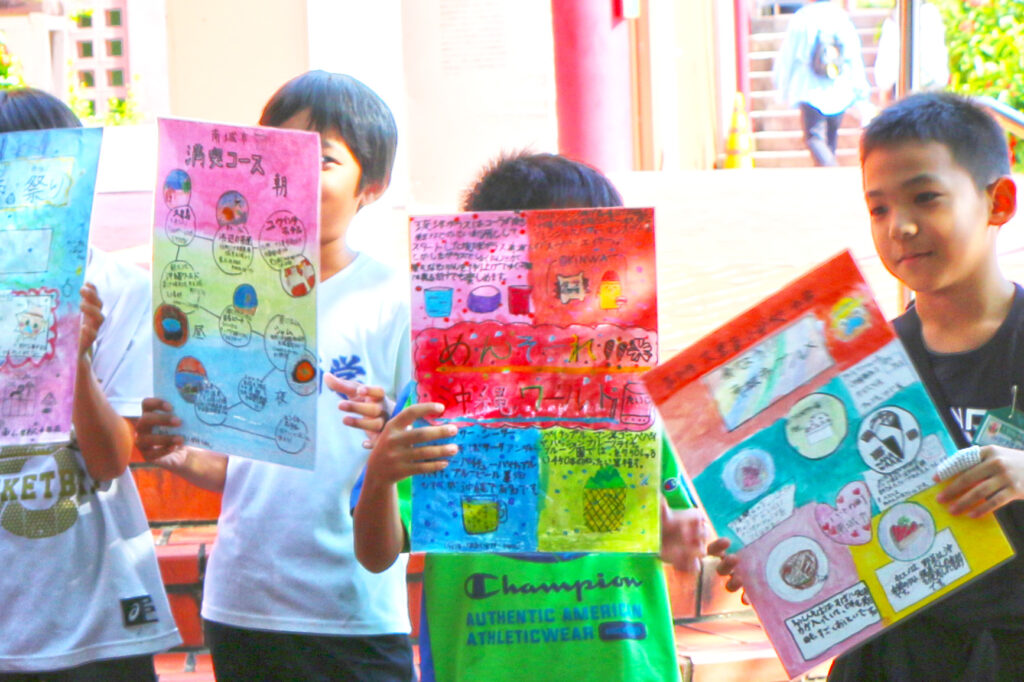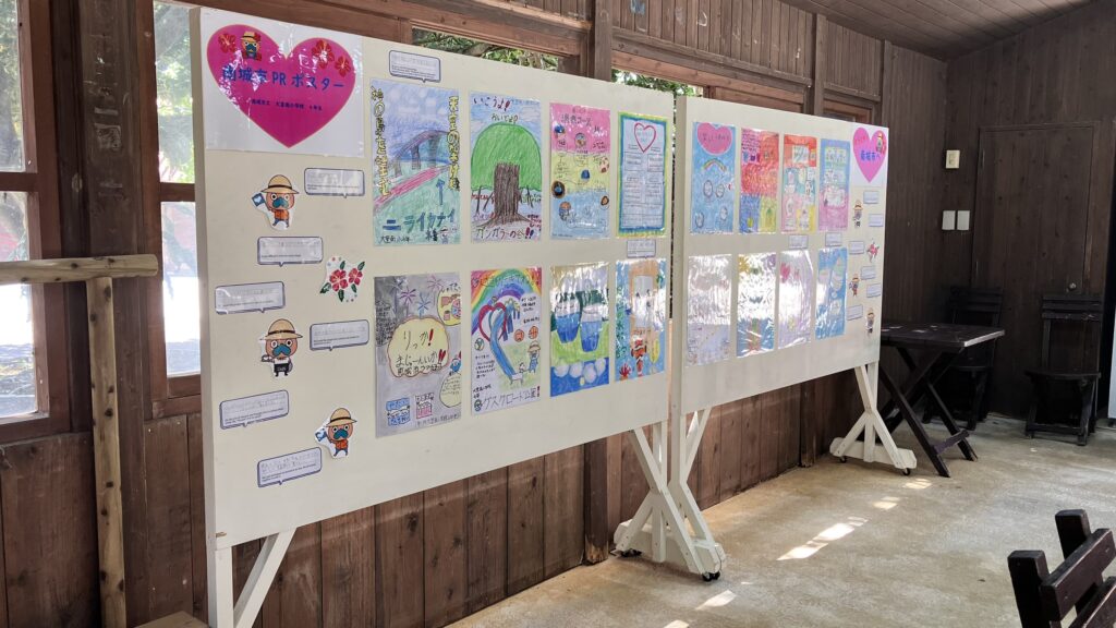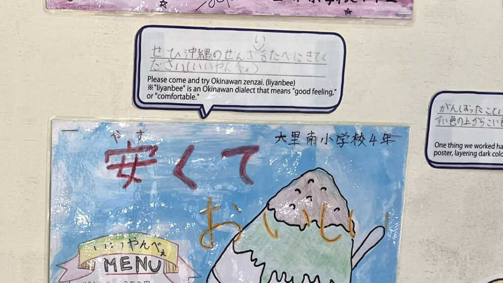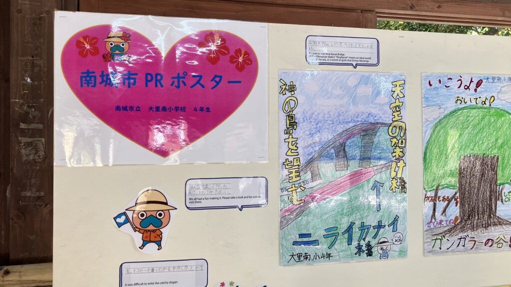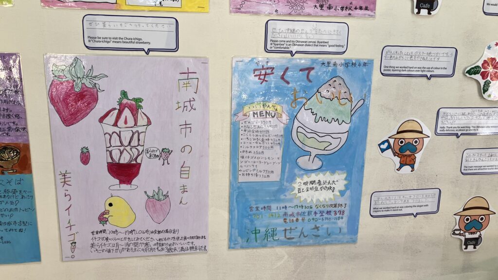 在沖繩世界內,當地啤酒咖啡館旁邊的休息場所,展示了當地南城市大裡南國小4年級學生為了展示自己地區(南城市)的魅力而製作的海報(16張)。